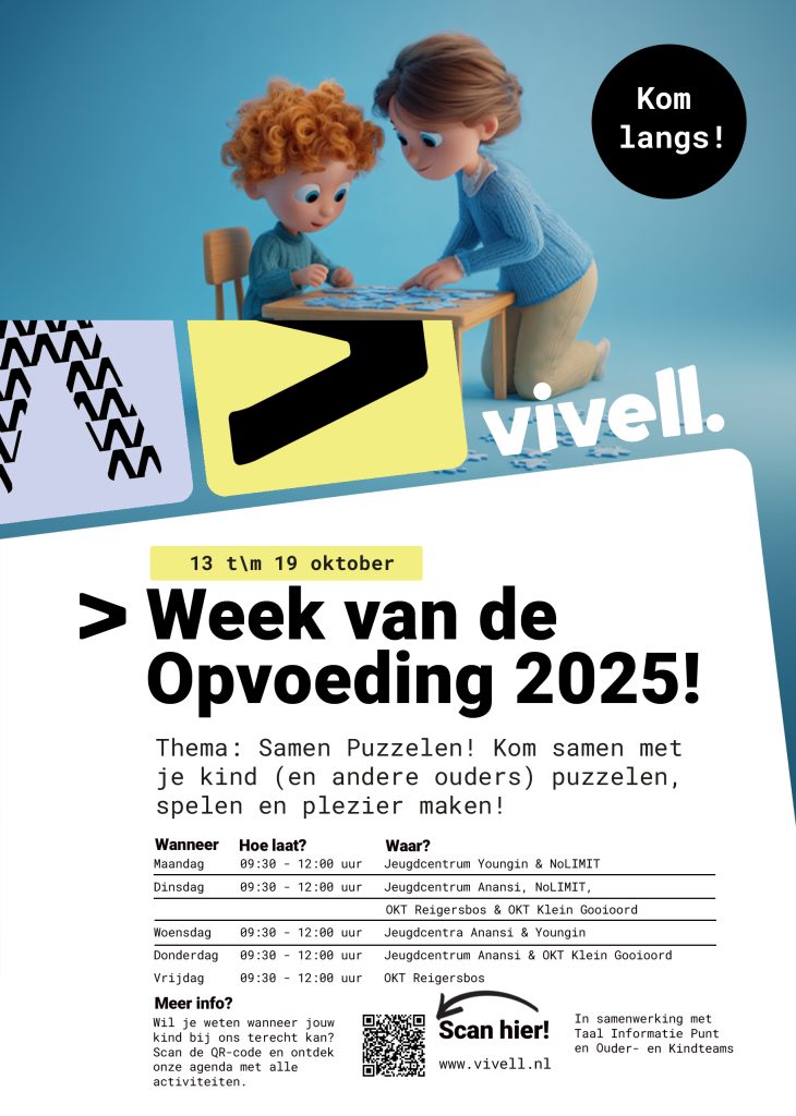 Van 13 t/m 19 oktober 2025 vieren we bij Stichting Vivell de Week van de Opvoeding. Een landelijke week waarin ouders, opvoeders en organisaties samen stilstaan bij het opvoeden én opgroeien. Dit jaar is het thema: Samen Puzzelen!